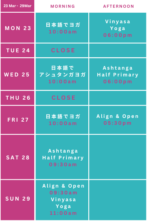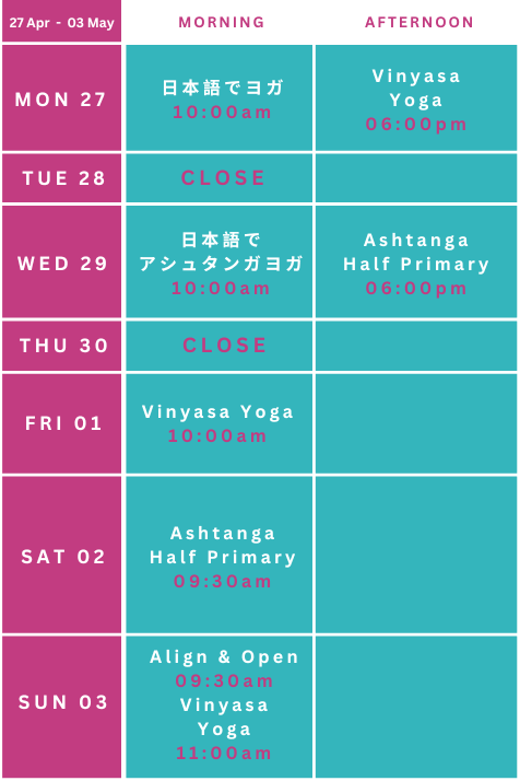 Each class is 75 minutes duration except Ashtanga Half Primary. Ashtanga Half Primary is 80 minutes duration.